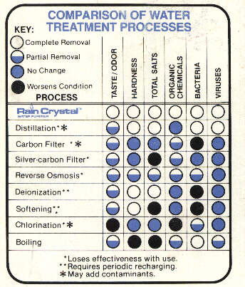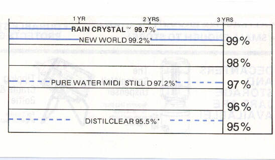 | Percentage of contamination removed. RAIN CRYSTALTM figures from California Analytical Laboratories. *Figures reflect salt removal as TDS from manufacturer brochures. ------ DOTTED LINES INDICATE INTERMITTENT CYCLE OF BATCH TYPE DISTILLERS. |