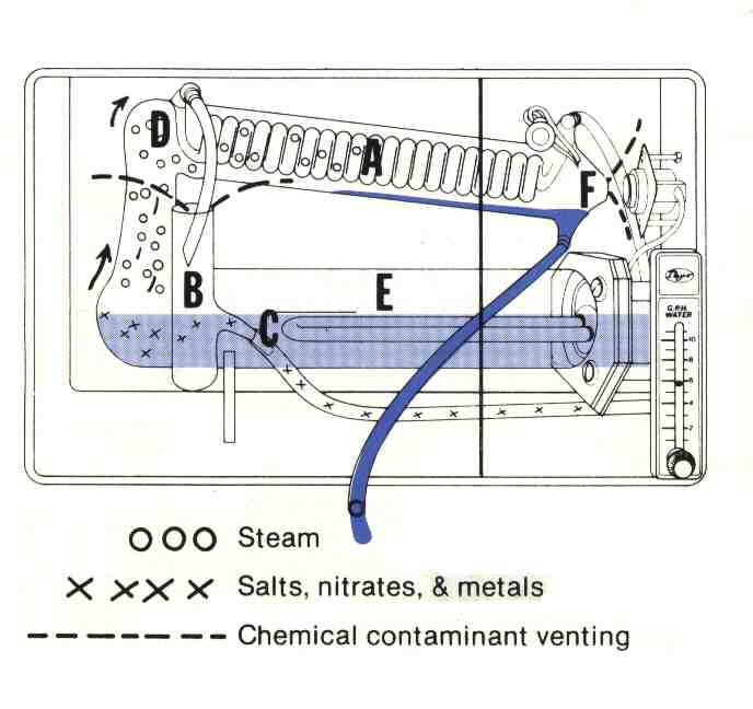 The Rain CrystalTM, in contrast, uses a two-stage system to remove disease-causing biological, mineral and chemical contaminants. First, cooling water is circulated through the condensing coil (A), warming to nearly boiling temperature. Dissolved gas bubbles appear in the coil and are discharged into the reservoir (B), either escaping here or discharged (C) to the drain. In the second stage, some chemicals left after step one may rise with the steam to be vented (F) from the condensing chamber (D), while others remain in the boiler (E) to be washed down the drain with minerals and other heavy contaminants. Test results reveal better than 98% removal of toxic wastes on a consistent basis, without carbon filtration.