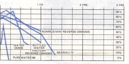 | HOW EFFECTIVE ARE WATER FILTERS OVER 3 YEARS? *Tests performed on Philadelphia water by Water Test Corp. 1983 *Filter container materials appear to contaminate filtered water when cartridge is new. Activated carbon filters remove some chemical contaminants only. Salts and dissolved metals are not extracted. Reverse osmosis is a microfiltration system which is partially efective for most pollutants including salts. These filters become less effective with use. Individual cartridges vary widely in capabilities. |